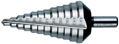 Ступенчатая конструкция является одним из последних изобретений в мире режущего инструмента. Она имеет универсальное применение, поскольку позволяет делать отверстия различного диаметра. Название типа связано с тем, что он представляет собой конус со ступеньками. Такое сверло может быть использовано только для работы с листовым металлом толщиной до 2 мм. Принцип действия заключается в том, что кончик инструмента врезается в материал, и когда он пробивается, то происходит контакт с более широкой частью конуса, которая просверливает углубление еще больше. Таким образом, чтобы получить требуемый диаметр нужно углубиться до нужной ступени.